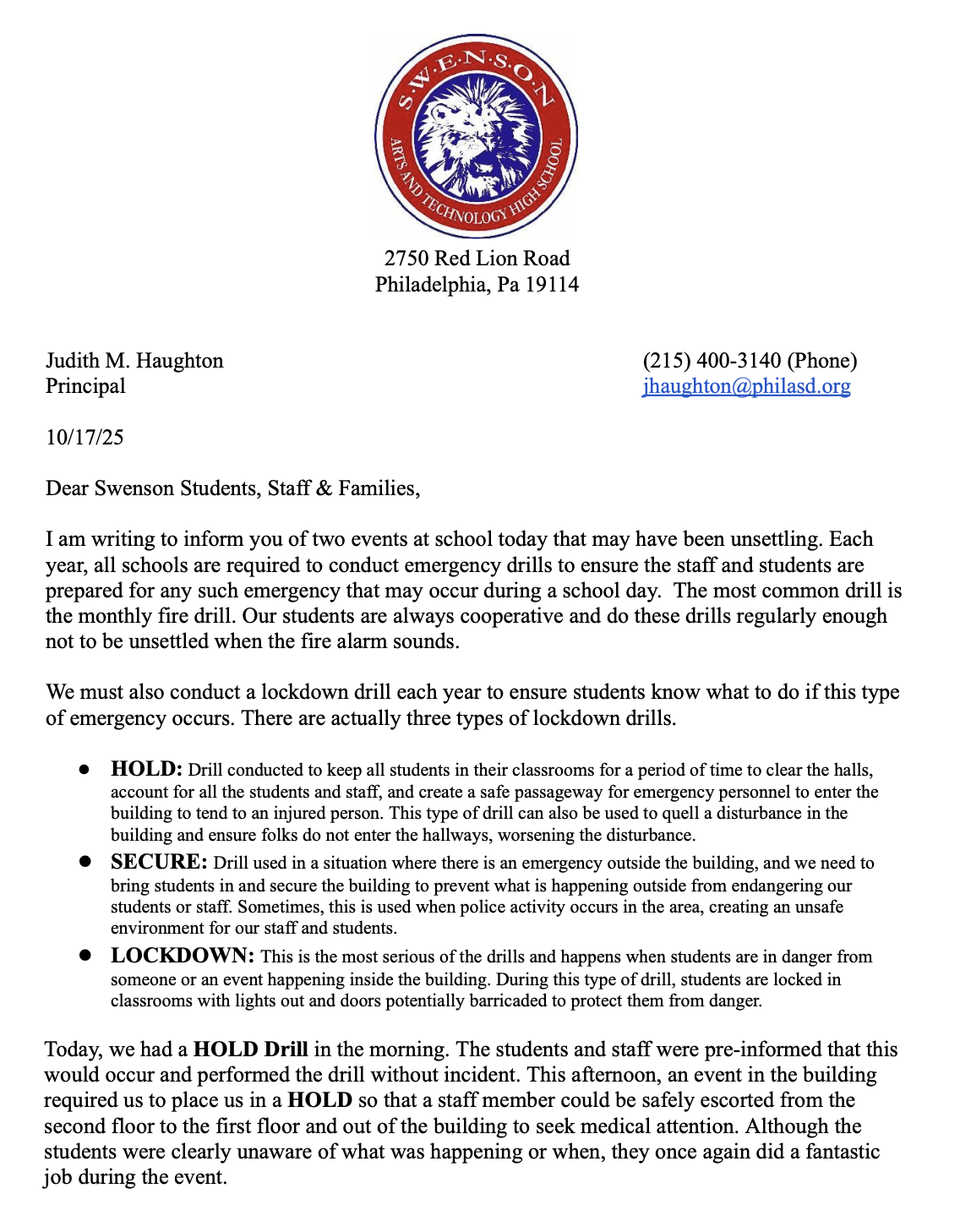 Once the main entrance way clears the Septa Buses and Yellow Buses and the majority of the students have cleared this area, it will be safe to pull on to campus. This usually happens by 2:45 pm.